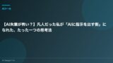 - 「AIが生成するナレーションやスライドの構成が、必ずしも意図通りになるとは限らない。」