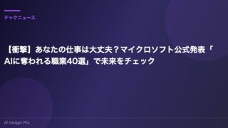 テックニュース 【衝撃】あなたの仕事は大丈夫?マイクロソフト公式発表「AIに奪われる職業40選」で未来をチェック 「AIに仕事が奪われるって本当…?」 「自分のスキルって、10年後も通用するのかな…?」そんな漠然とした不安を抱えていませんか? AIの進化が目覚ましい昨今、他人事ではないと感じている方も多いはずです。私もその一人でした。しかし、もしその不... 2025.08.01 テックニュース